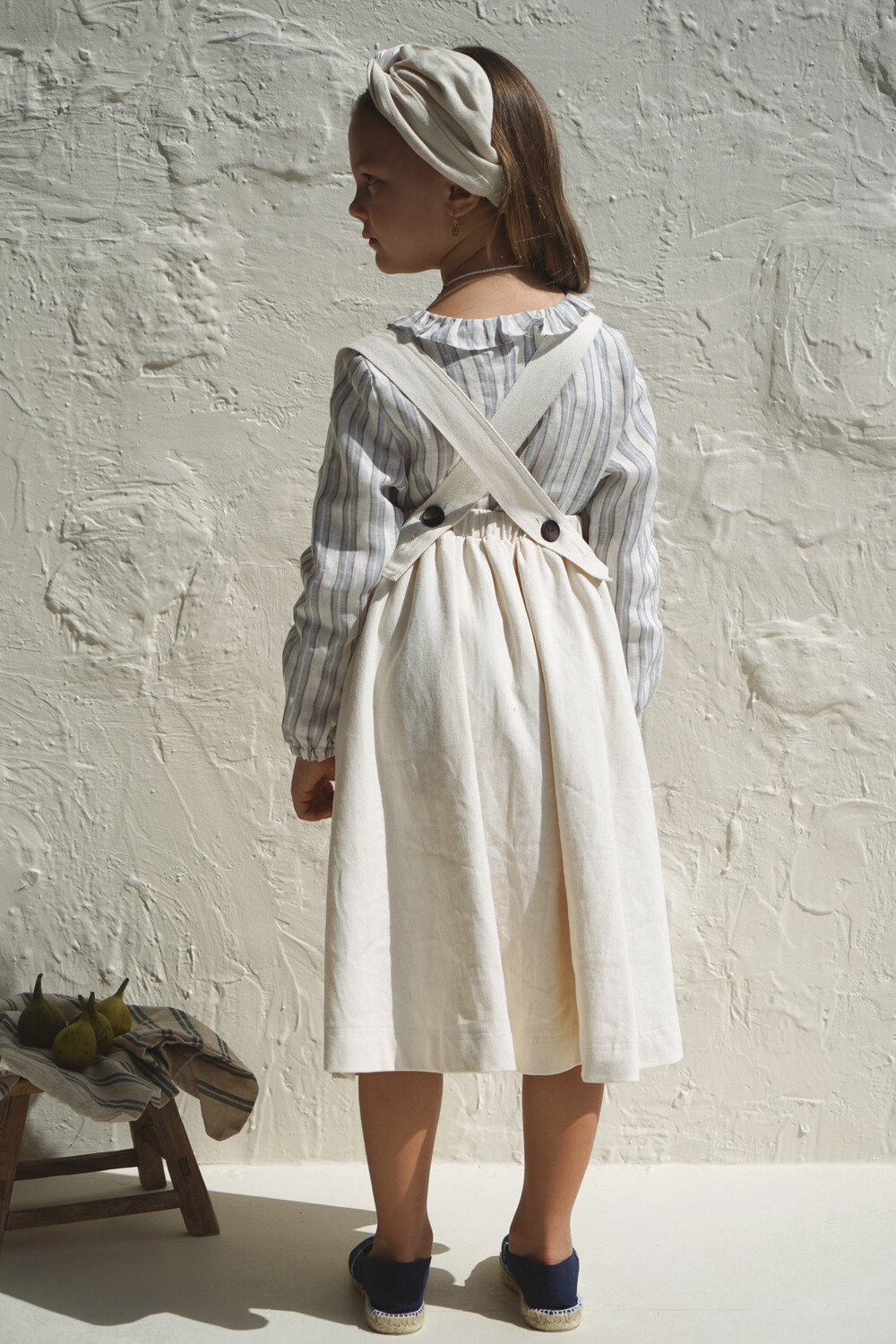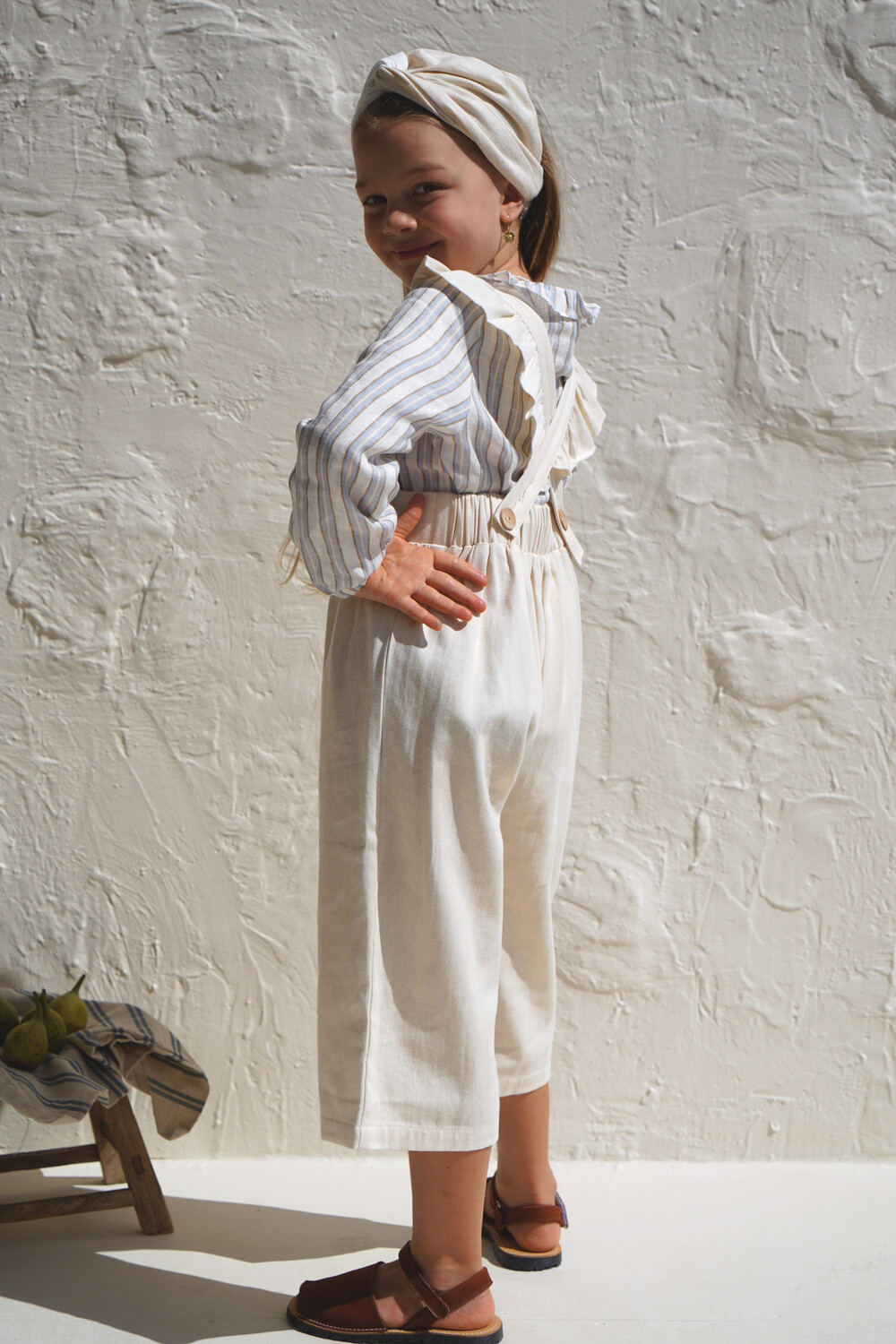 The sweet Esme Blouse defined by a darling ruffled collar that brings an effortless charm to the silhouette. It’s made from our dreamy Santorini Linen with pretty wooden buttons through the front, delicate elasticised cuffs and fully lined in pure cotton. Ideal for layering under your favourite pinafore or playsuit. Made of 100% linen, fully lined.