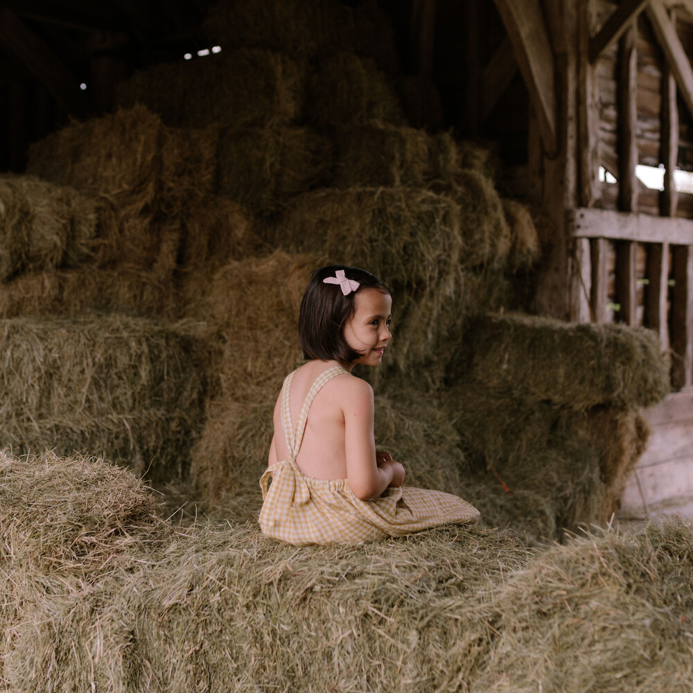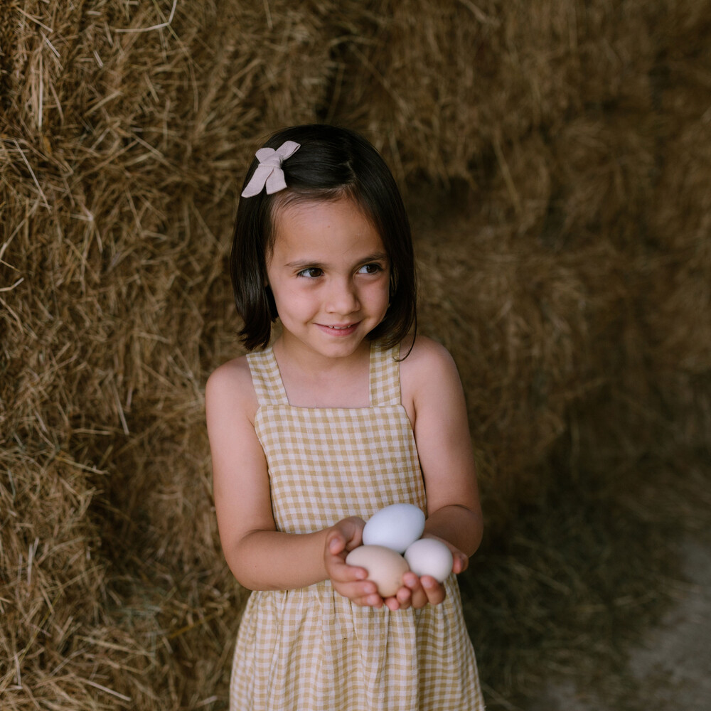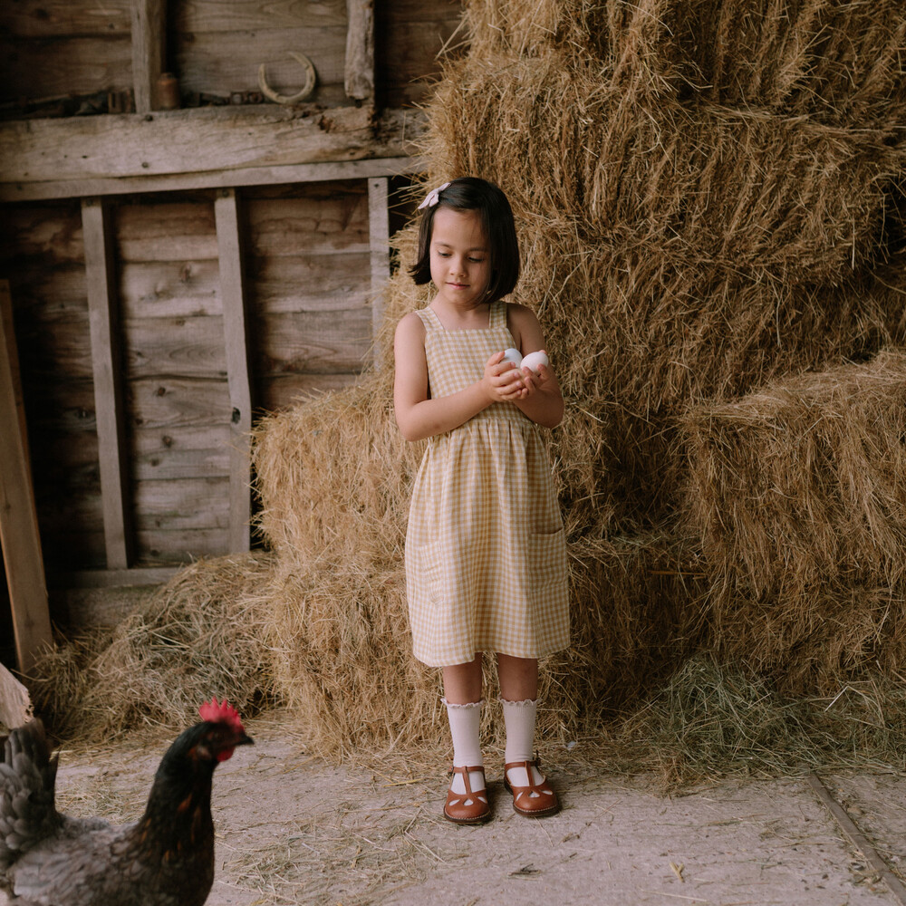 Classic pinafore shaped dress, with gathered skirt front and elasticated waist back for a comfortable fit. Straps tie through loops at the back so fully adjustable. Made from soft, hay check linen - a small scale warm cream check interwoven with a beautiful mustard yellow colour. Designed to sit above the knee. Perfect for layering in cooler weather or stripping back in the summer.