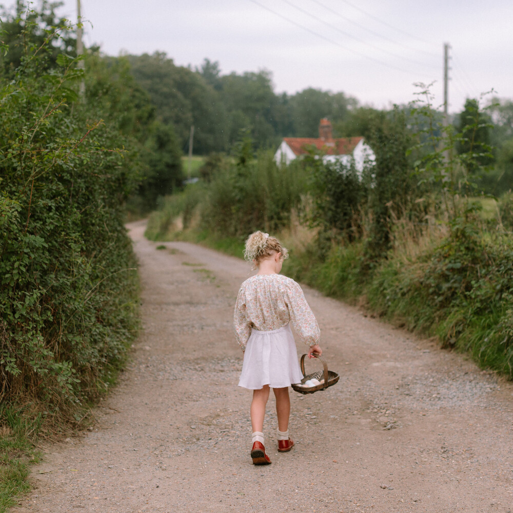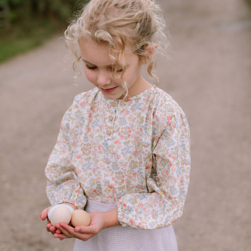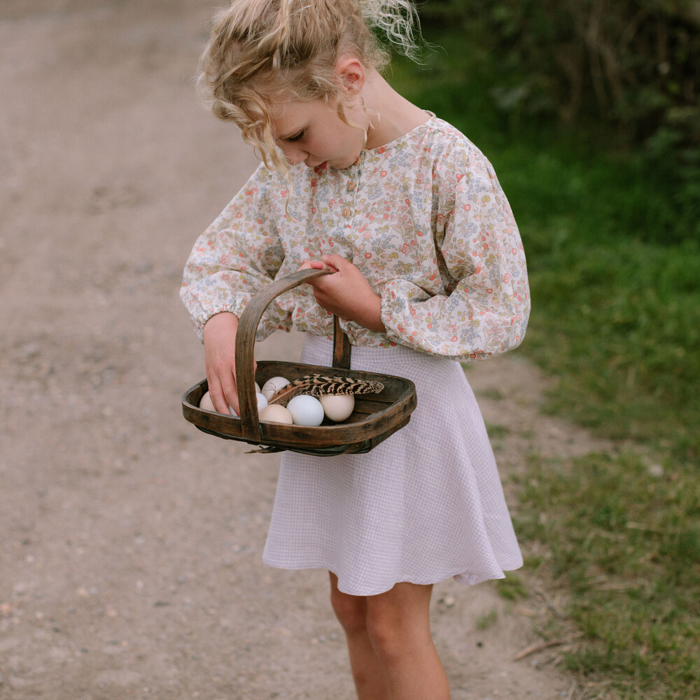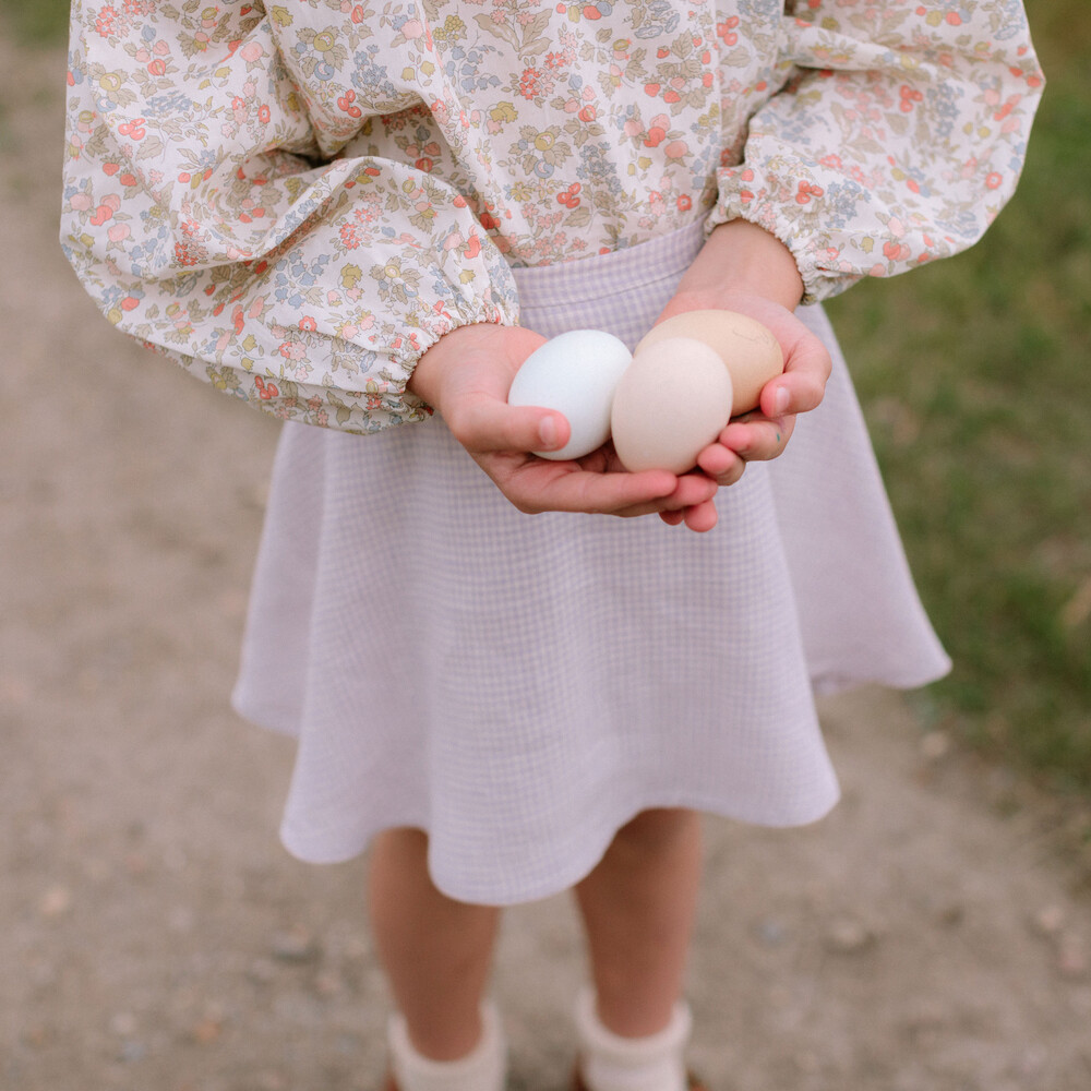 Half circle skirt, with fixed front waistband and elasticated back waistband for extra comfort. Cut on the cross so fabric hangs beautifully and skirt ‘swings’. Designed to sit above the knee. Made from soft, lavender check linen - a mini scale warm cream check interwoven with a beautiful pale lilac colour.