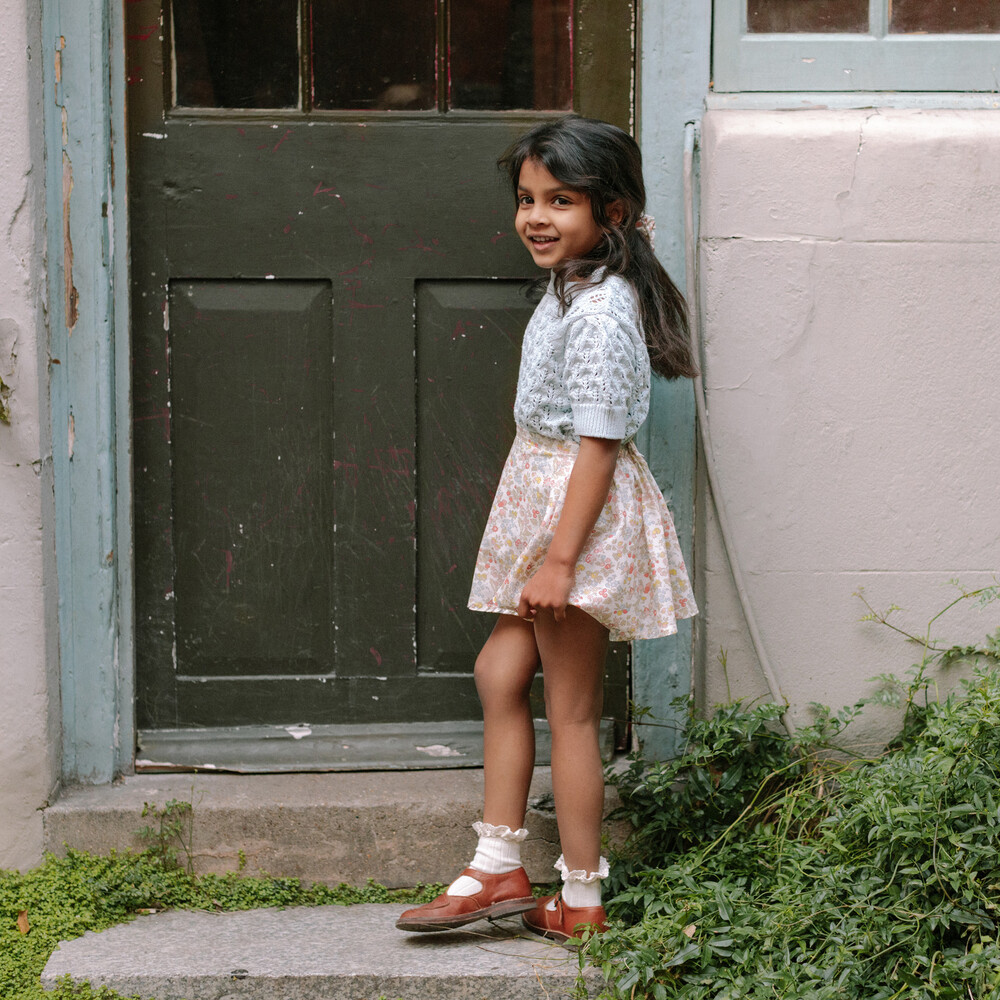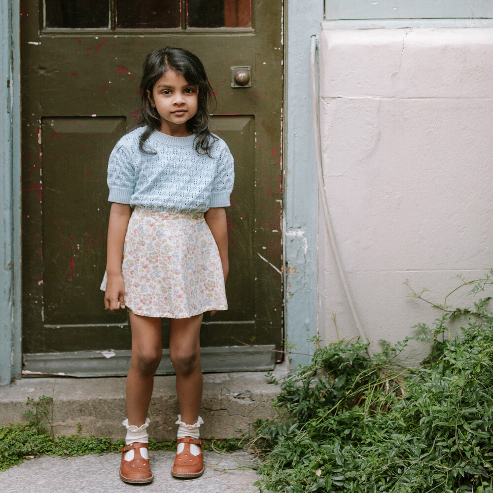Half circle skirt, with fixed front waistband and elasticated back waistband for extra comfort. Cut on the cross so fabric hangs beautifully and skirt ‘swings’. Designed to sit above the knee. Made from beautiful Nancy Ann Liberty print tana lawn organic cotton, an exclusive print to NQ.