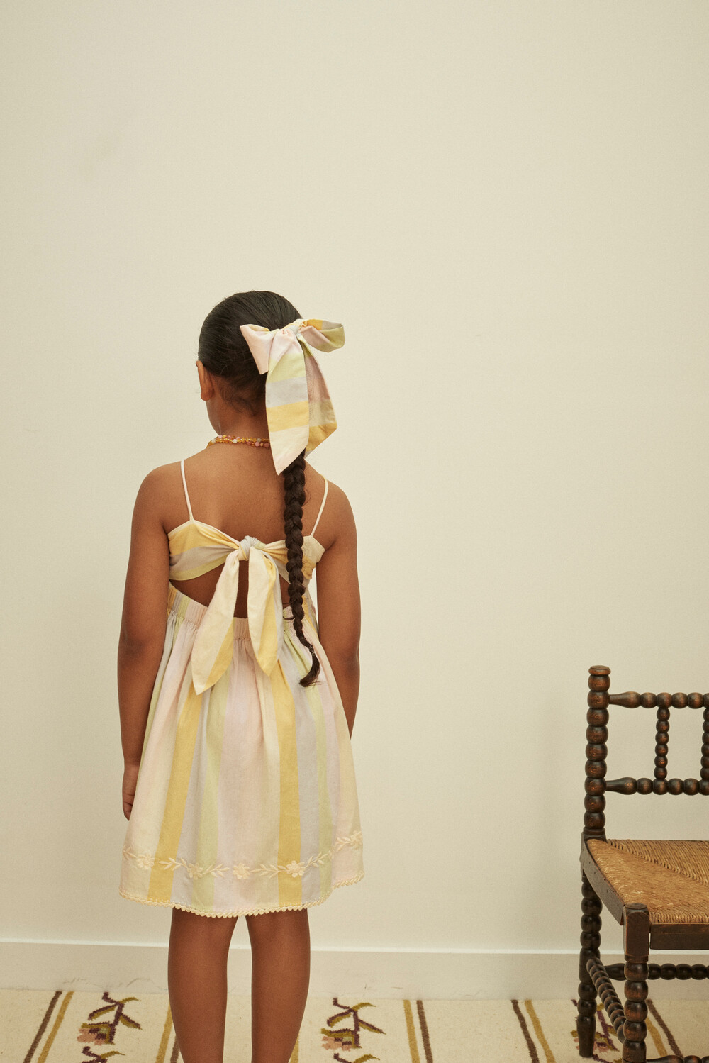 Our classic Magrit sundress style is updated in the season’s pastel rainbow ‘painters stripe’ cotton, for a sweet summer holiday mood. Featuring contrast floral embroidery at chest and hem, a statement tie back, shoestring straps, elasticated back waist and crochet detail at hem. We love Magrit worn simply with sandals for holidays, or accessorised for parties.