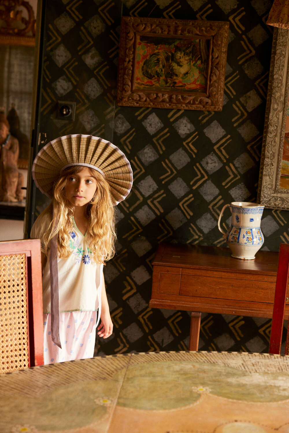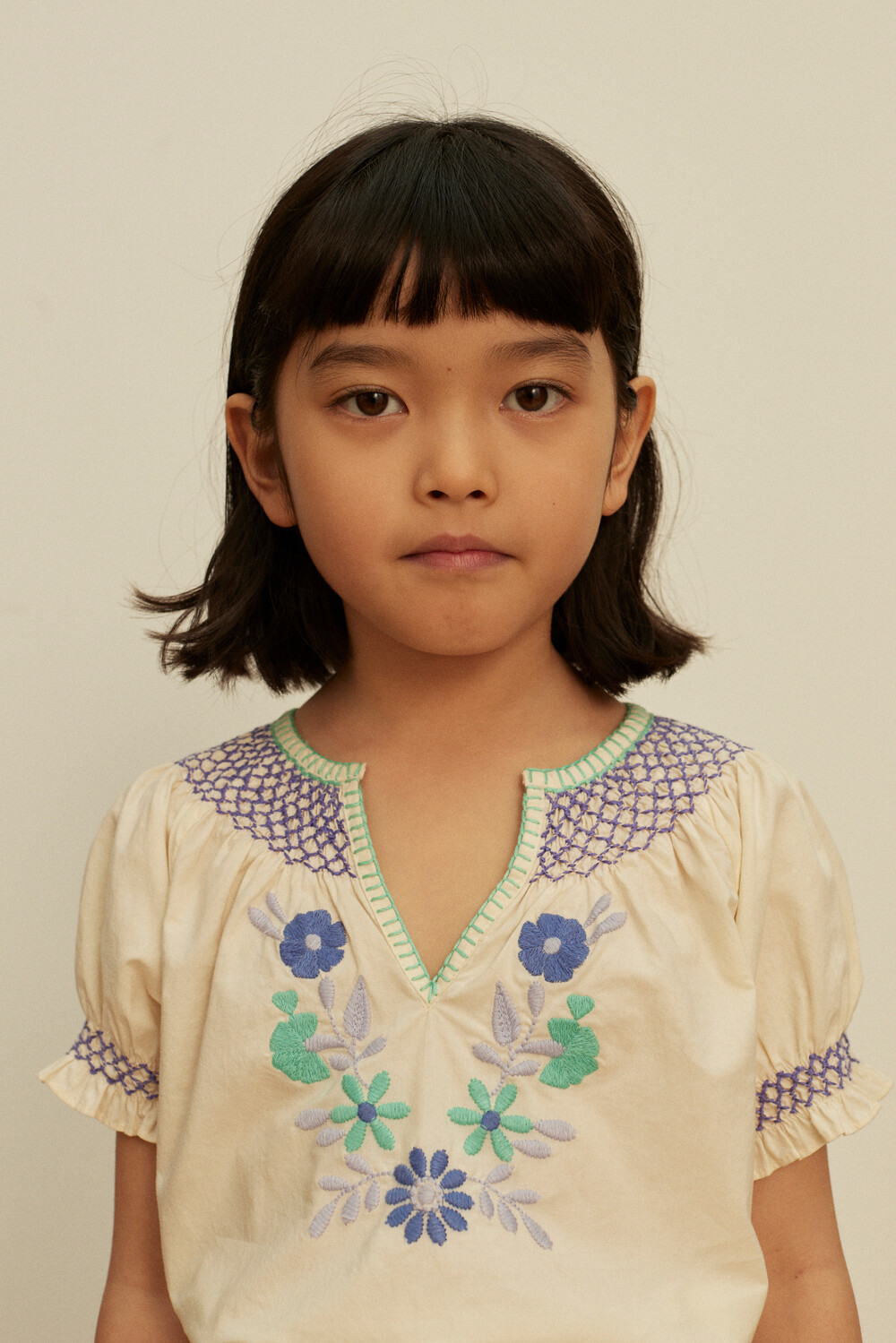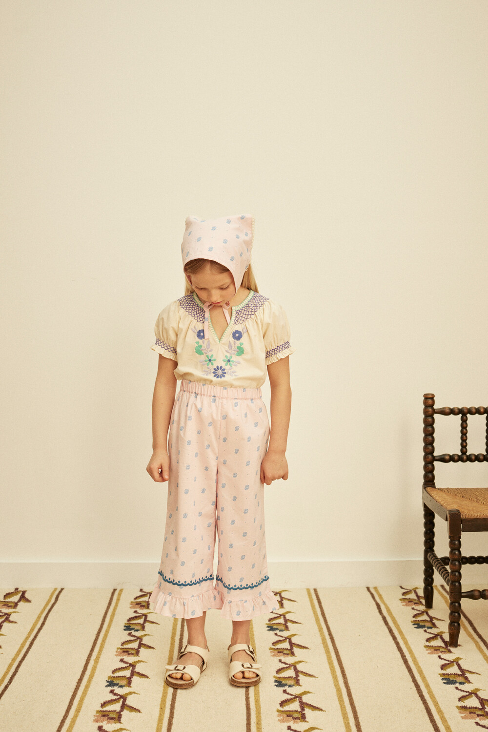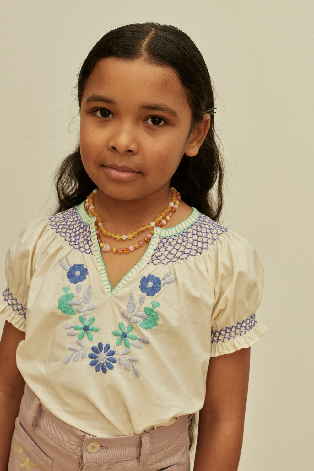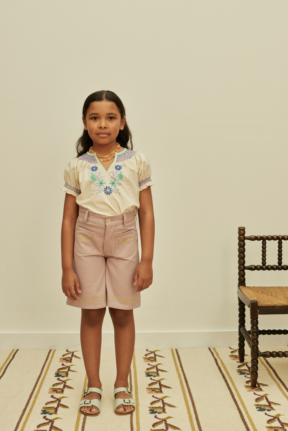 The vintage-inspired Pol blouse brings a sweet bohemian mood. Her cream cotton base is highlighted by tonal lavender and ‘seaglass’ shades, with naive folk embroidery at chest, hand smocking at neckline and sleeves, and blanket stitch at neckline and hem. We love Pol worn with our Casey jeans and shorts.