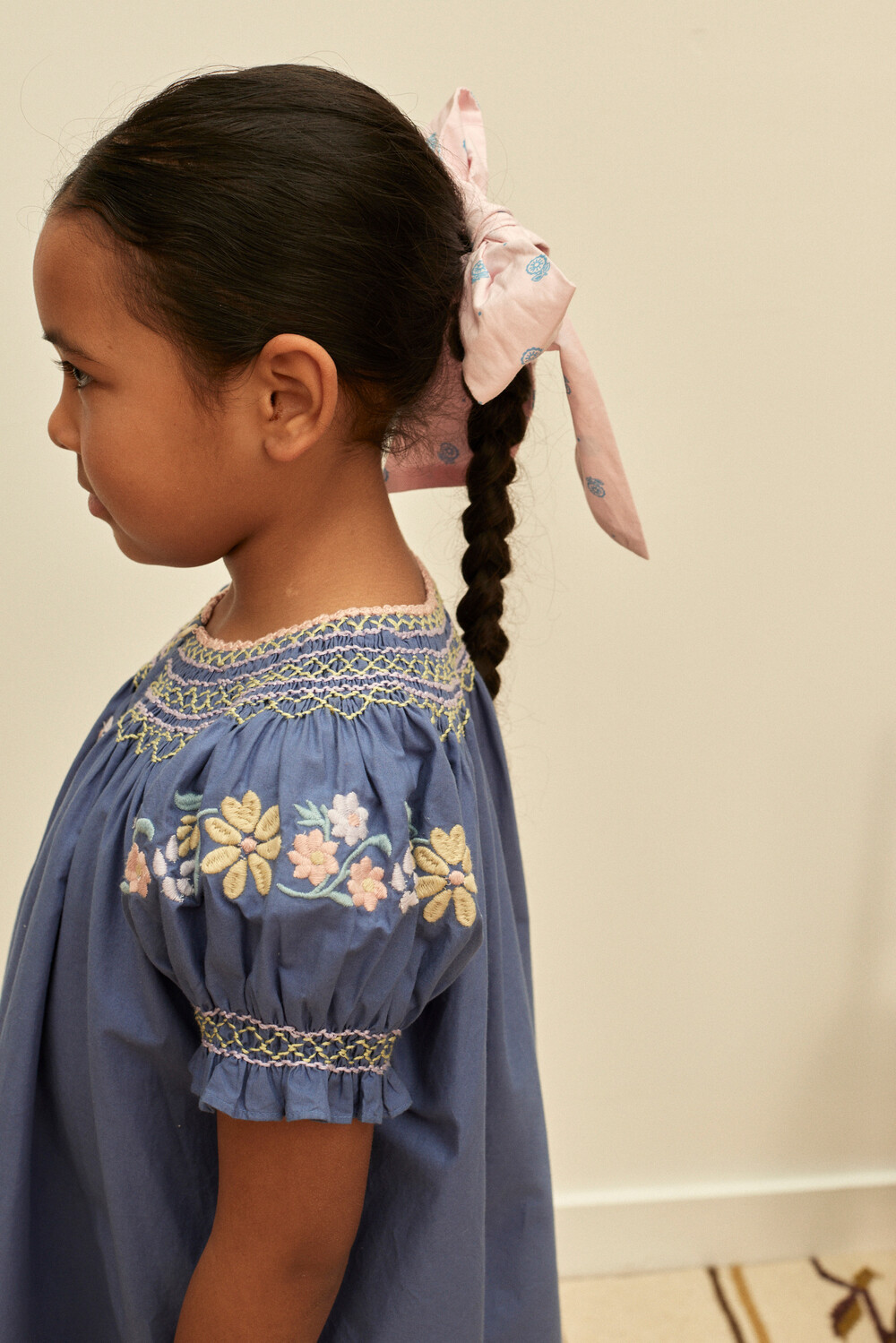A pretty, vintage-inspired smock dress, Verna comes in our striking ‘azul’ cotton with contrast two-tone hand smocking at neckline and sleeves, and pastel-toned embroideries at sleeves, chest and hem. Finished with contrast crochet at neckline and hand blanket stitch detail at hem panel. Keyhole fastening at front. With a swingy, full silhouette and sweet puff sleeves we love Verna’s classic vintage mood.