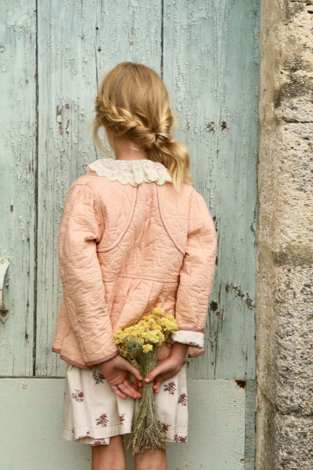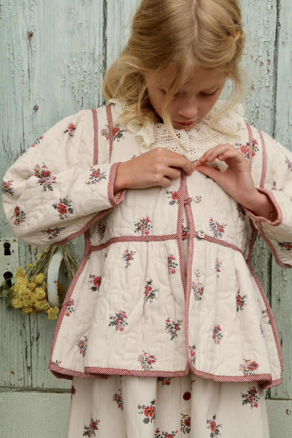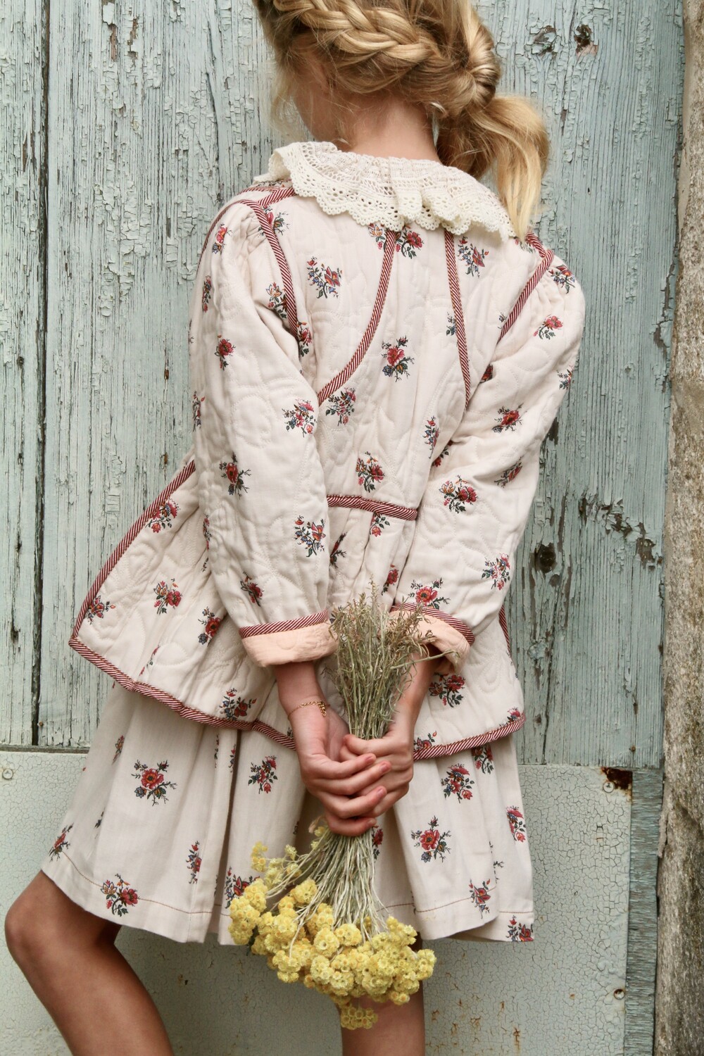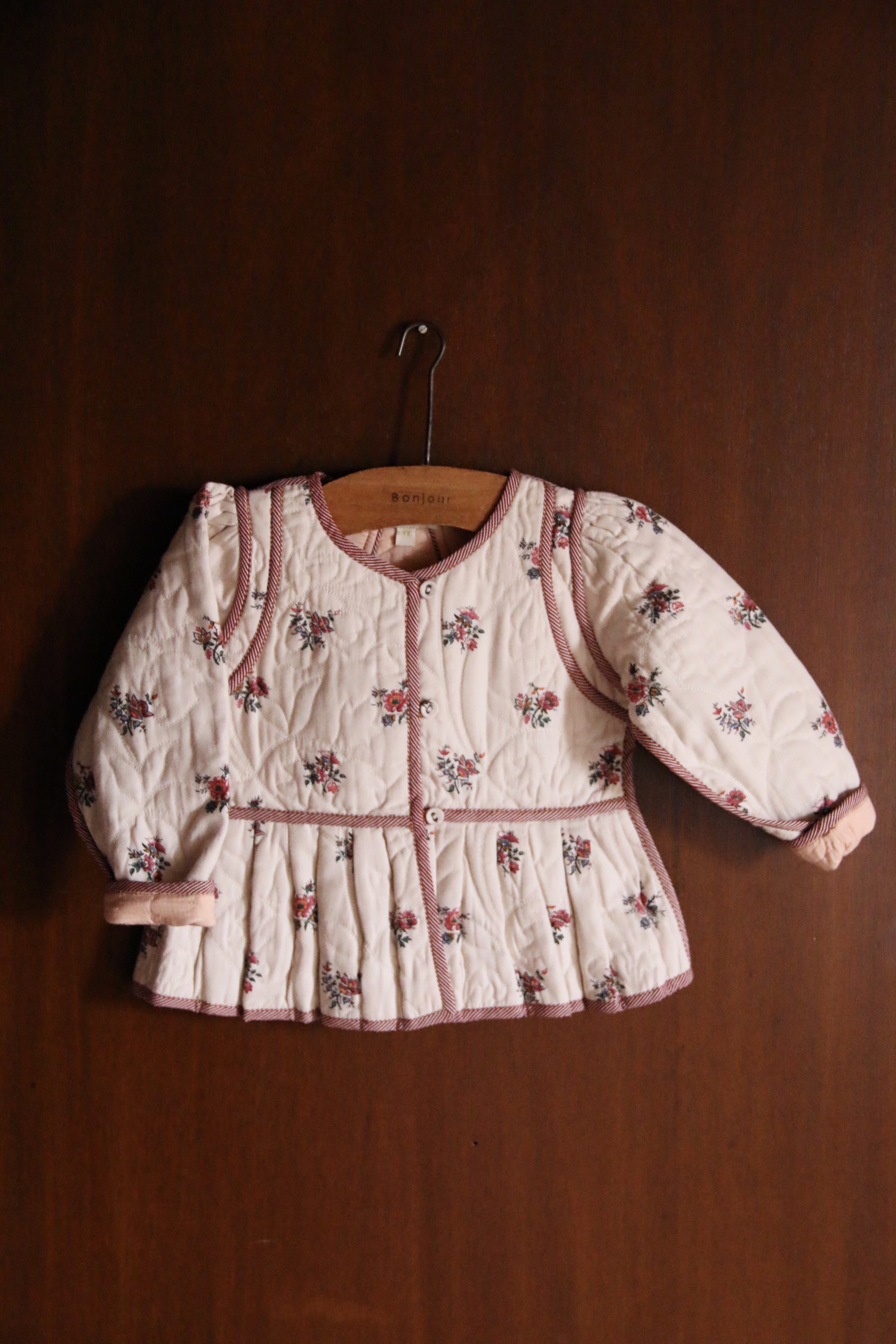 Quilted jacket_Denim Garden flowers print / Red stripe print piping_Bonjour