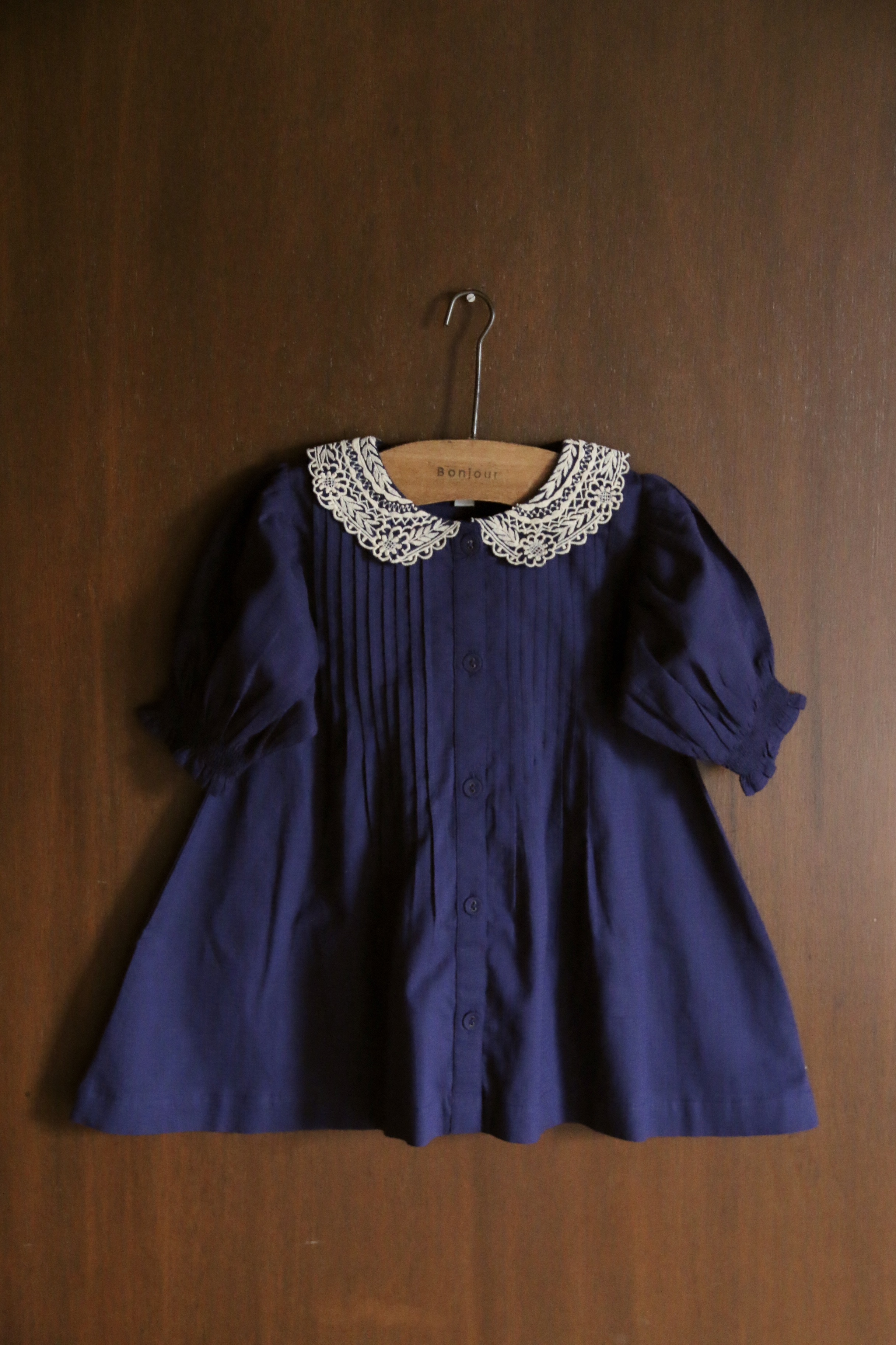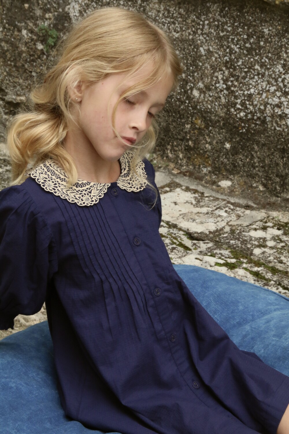 Long blouse with emb. collar_Navy blue check voile_Bonjour