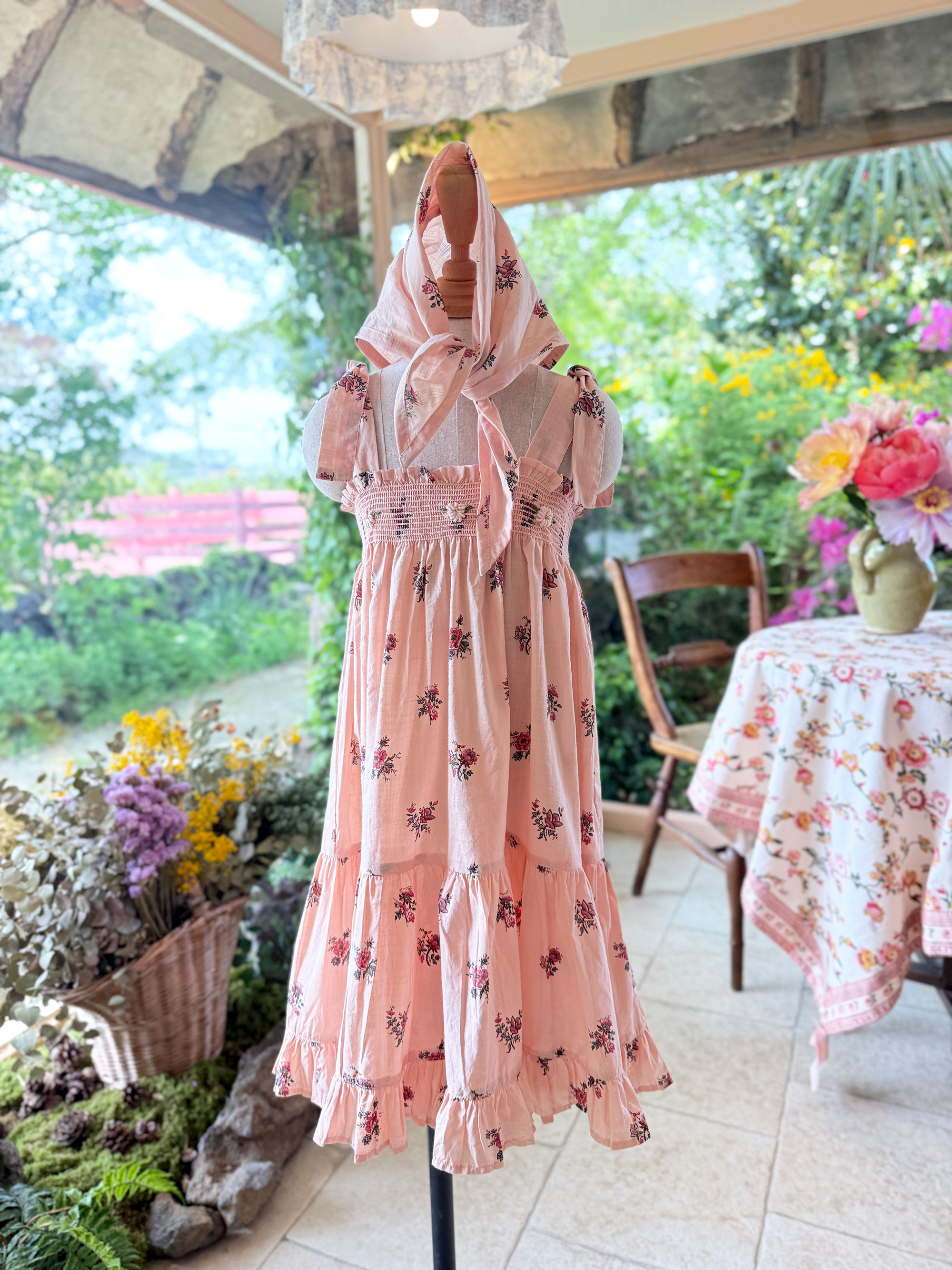 (KR)Skirt dress with scarf_Pink garden flowers print - cotton voile_Bonjour