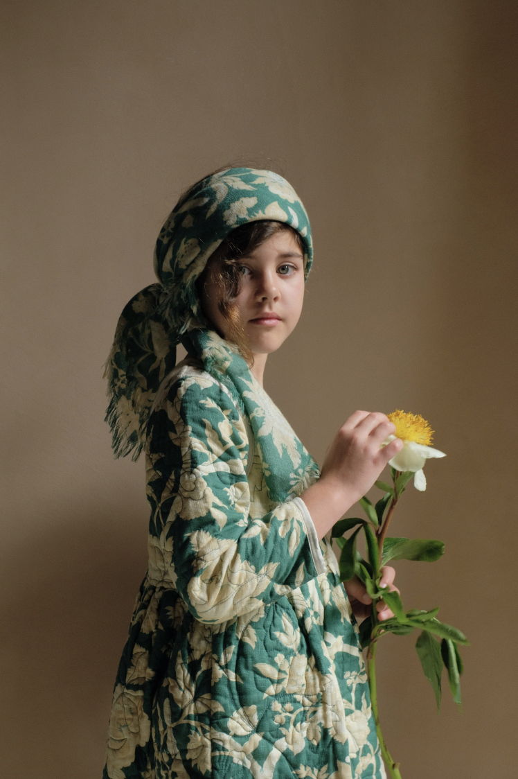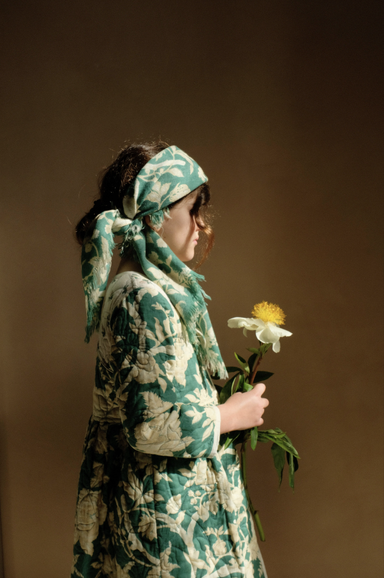 WOOL SHAWL WITH FRINGES_Autumnal green flowers wool_Bonjour
