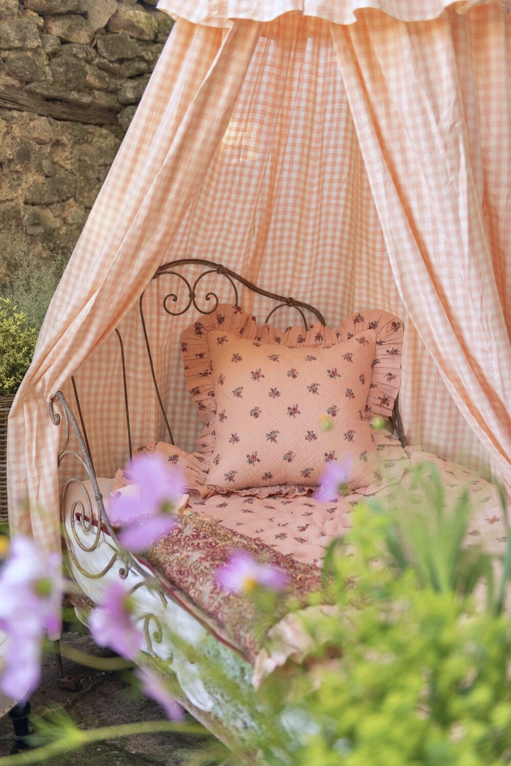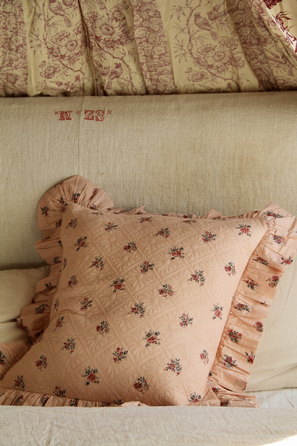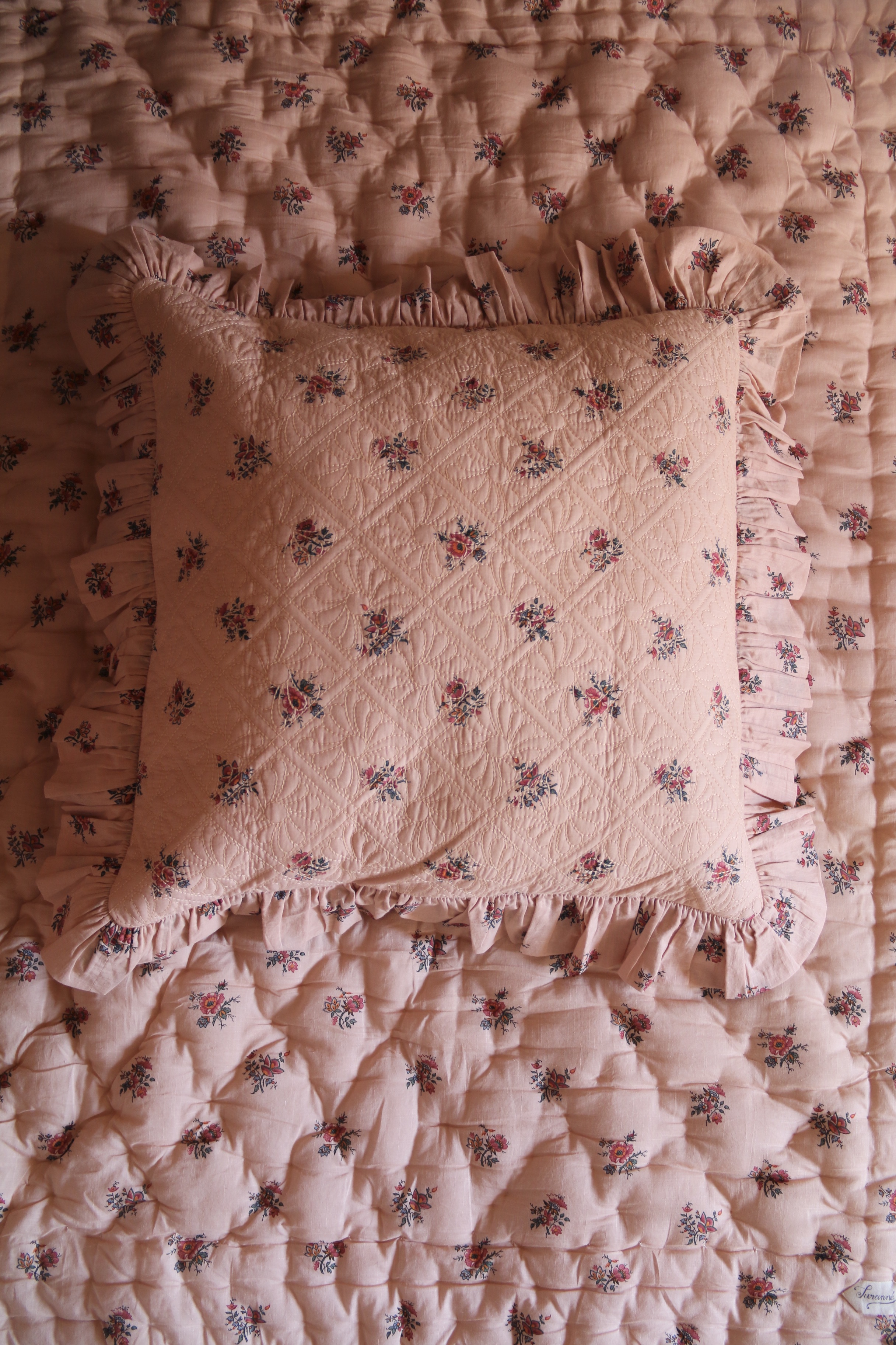 Quilted pillow case with flounce Pink Garden flower print_Suranné
