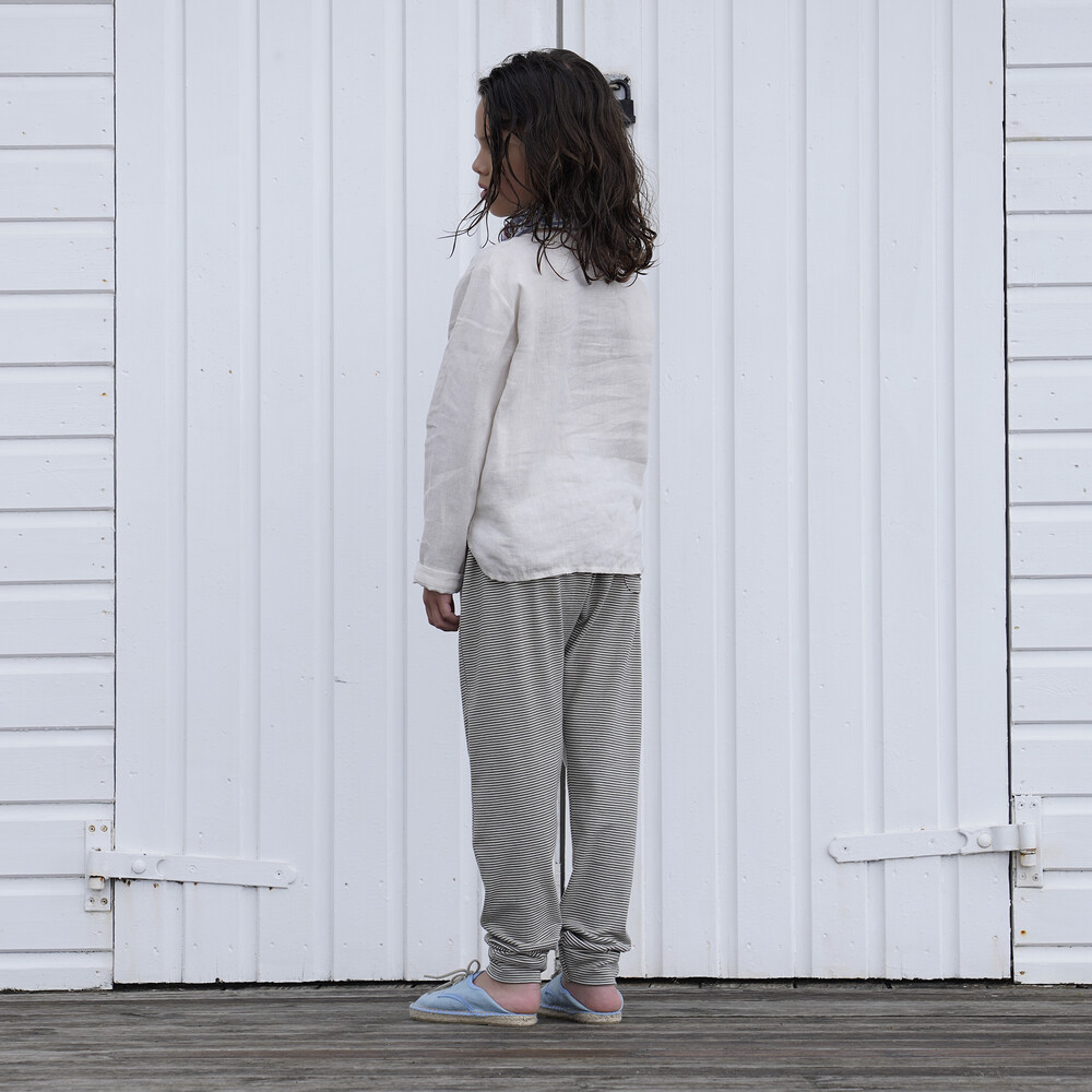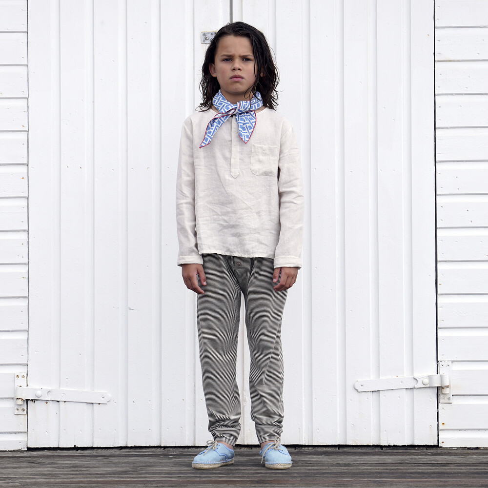 Our Maon Shirt is a warm weather staple. With its straight silhouette and collarless neckline in breathable linen, you’d be forgiven for feeling like you’re on holiday when your little one wears this one. 100% organic linen and printed cotton voile and muslin, Mushroom, roast solids and our Boat print and Cross print.